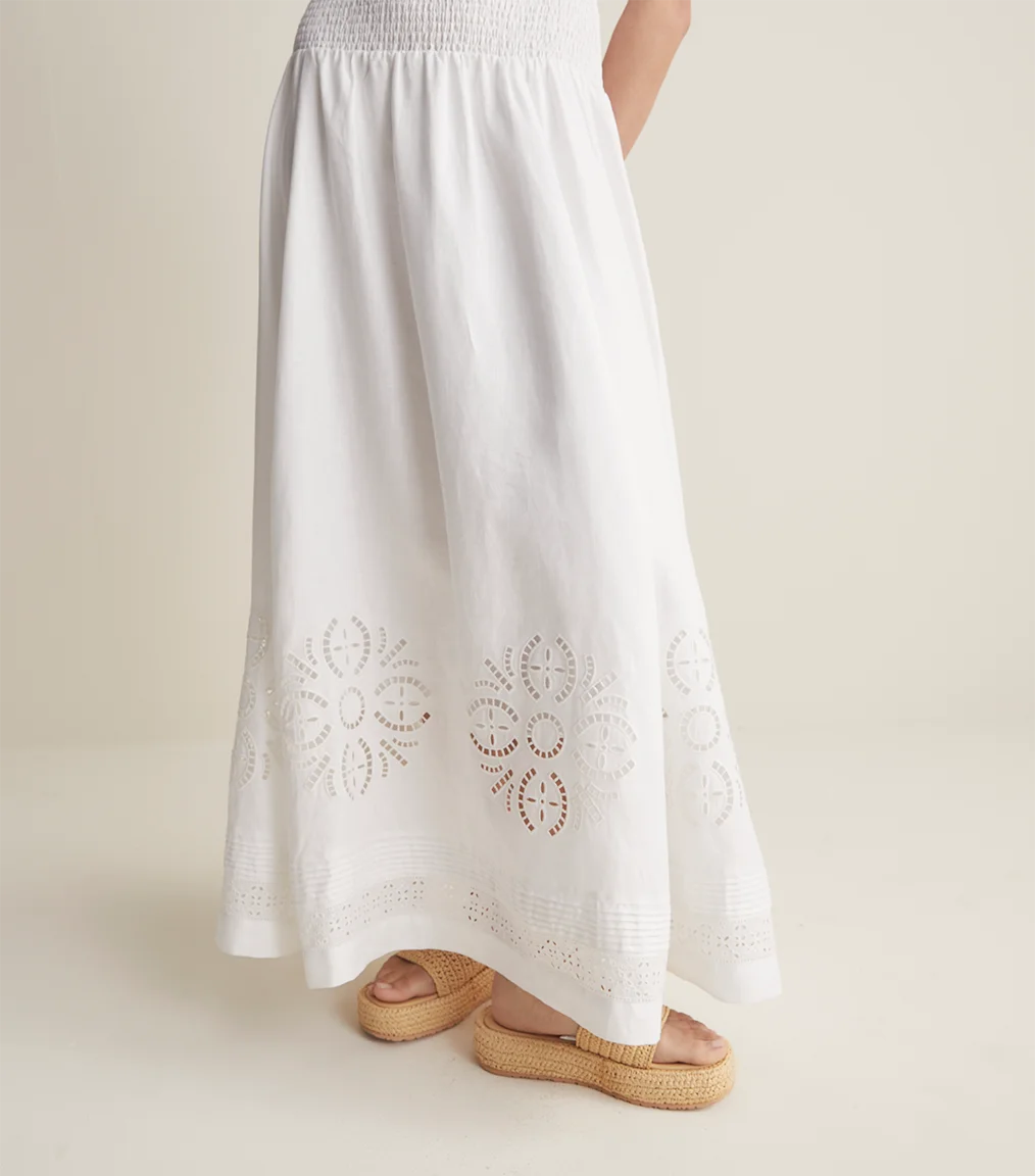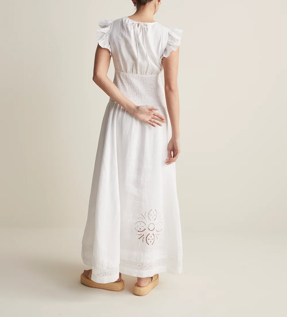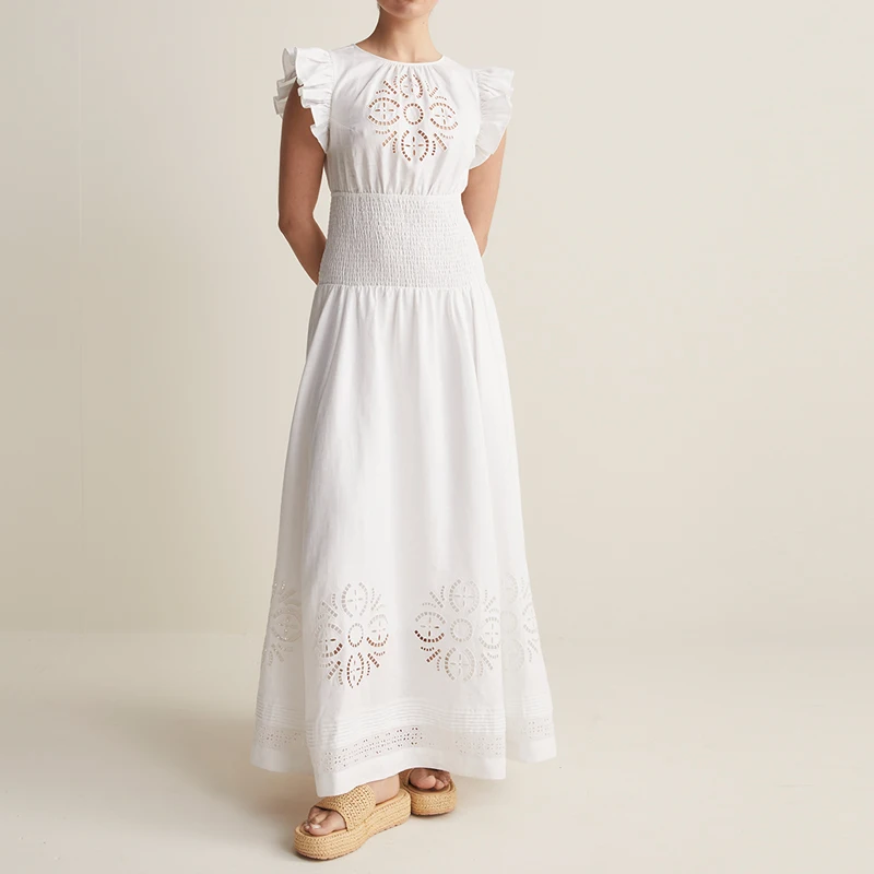 Women's Casual Cotton Linen Embroidered Suspender Skirts Sexy Maxi Dress with Ruffles Embroidery Cut-Out Dresses